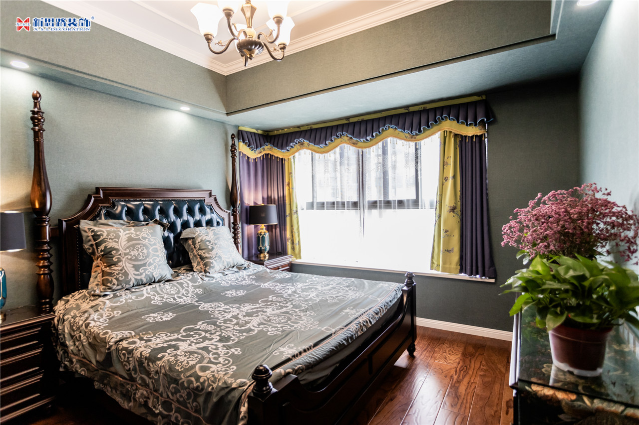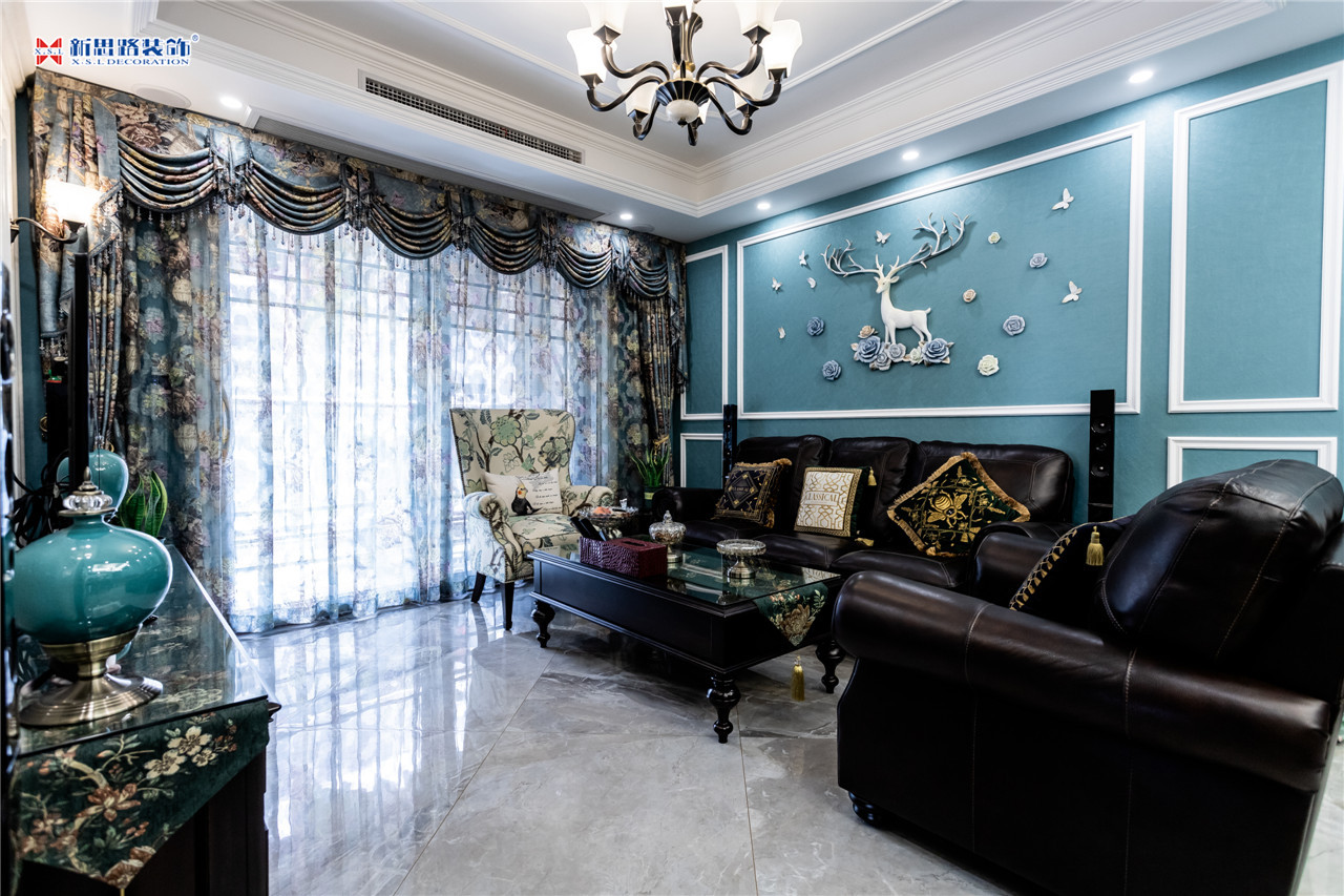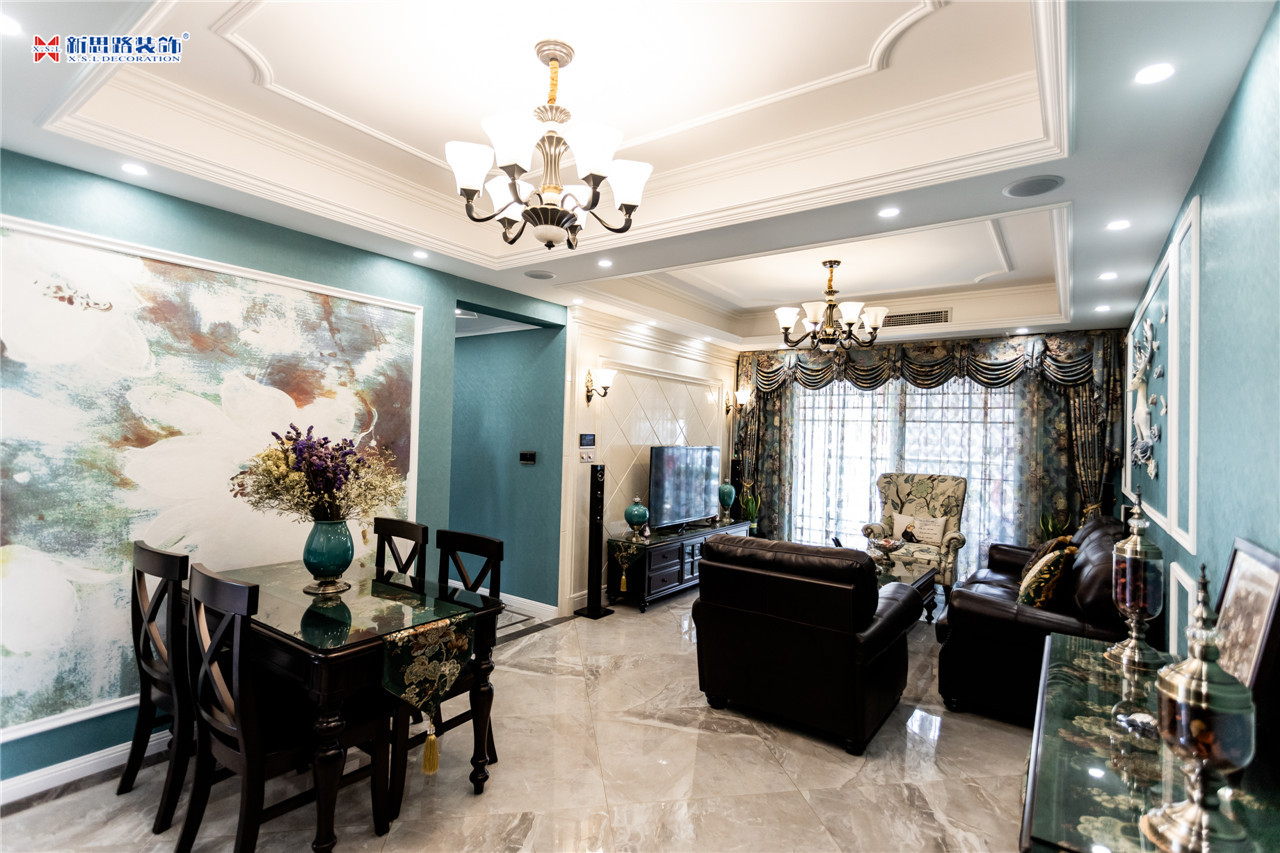 沙發(fā)背景墻使用石膏線材勾畫幾何圖形,古典優(yōu)雅;陶瓷的小鹿漫步花間,野趣橫生。復(fù)古花色的窗簾與真皮質(zhì)地的沙發(fā)以及實(shí)木電視柜搭配起來正合適,線條分割成菱形網(wǎng)格狀的乳白色電視背景墻大方低調(diào),黃銅色美式吊燈干凈明亮。深墨綠色的織錦桌旗無形中又添了點(diǎn)奢華意味,油青色的仿古裝飾擺件也是非常經(jīng)典的美式元素體現(xiàn)。