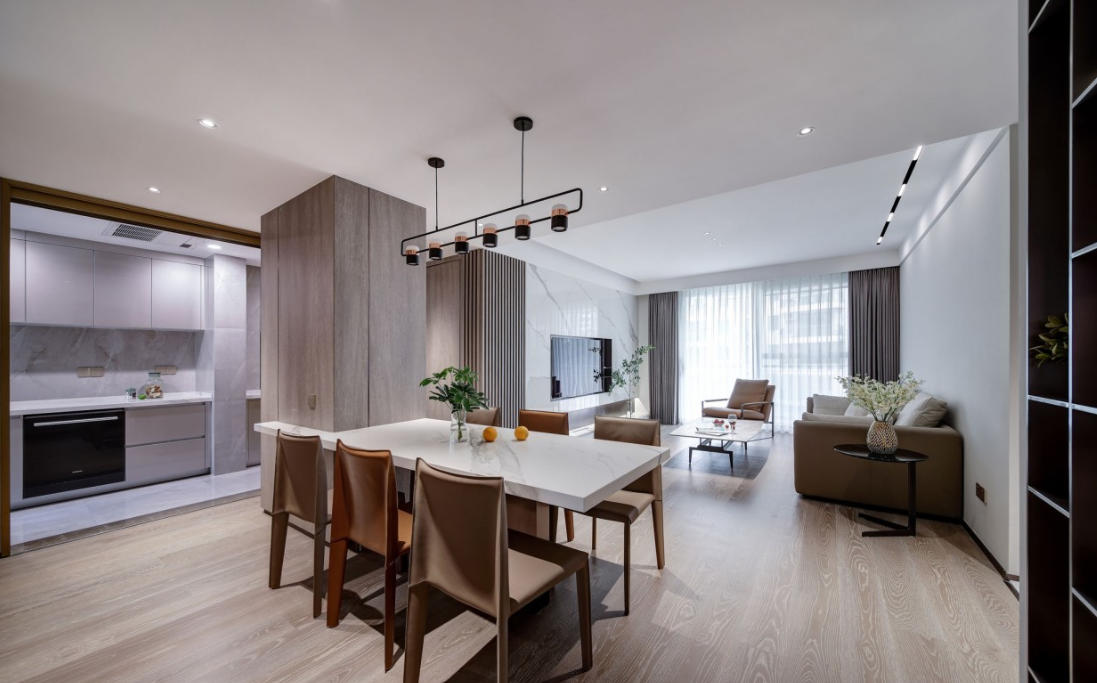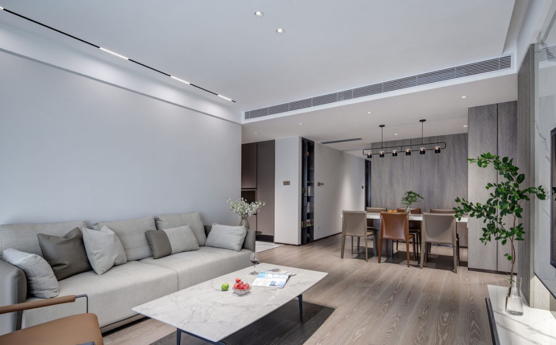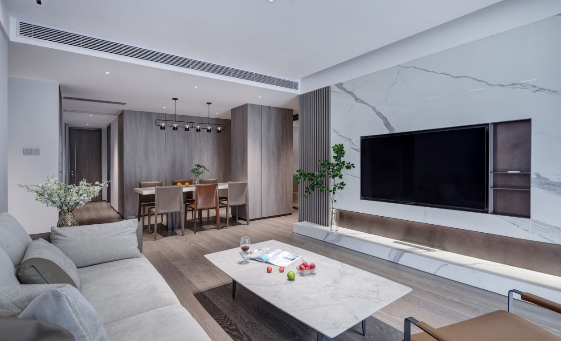 采用明亮而不眩目的無(wú)主燈設(shè)計(jì)筒燈與磁吸燈簡(jiǎn)約靈活的泛光照明電視背景墻下隱藏?zé)魩У男Ч麪I(yíng)造優(yōu)化了空間形體以及局部的明暗關(guān)系
