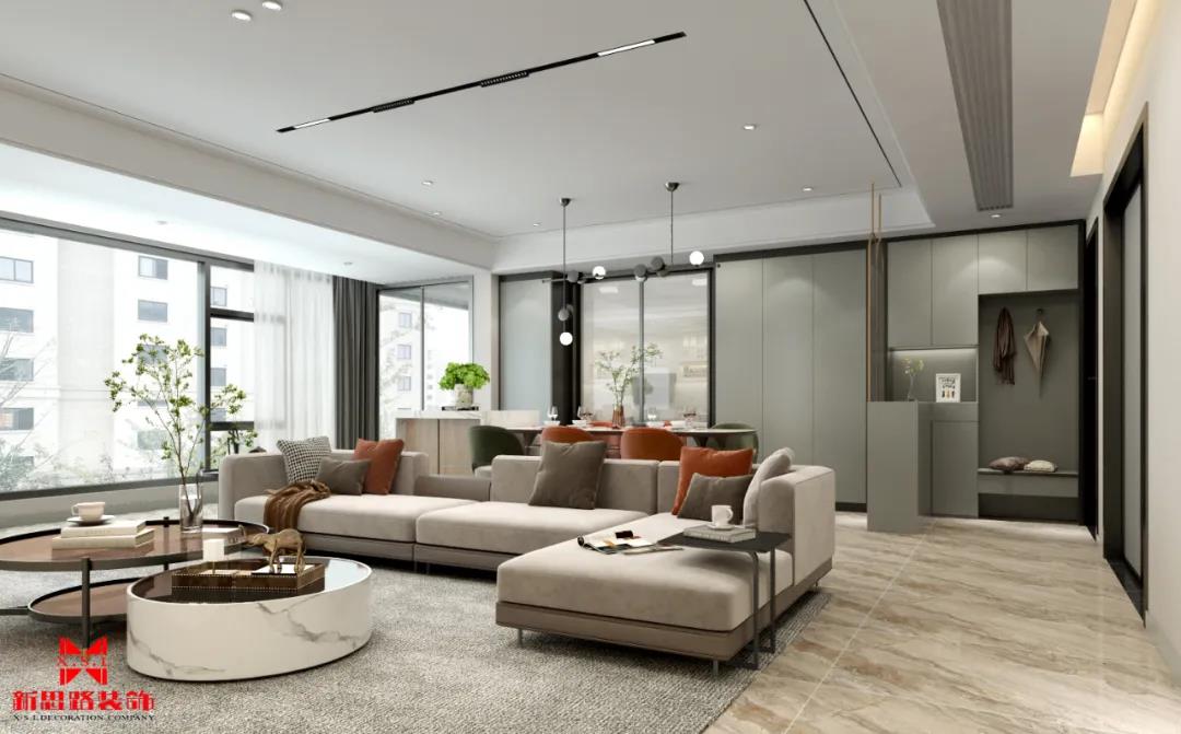 客廳采用無主燈設(shè)計(jì),線條磁吸燈造型流暢動(dòng)感又富有藝術(shù)氣息。接近落地的玻璃窗起到了極佳的采光作用,配合柔和的室內(nèi)光源與布藝沙發(fā),為空間增添不少溫馨感。