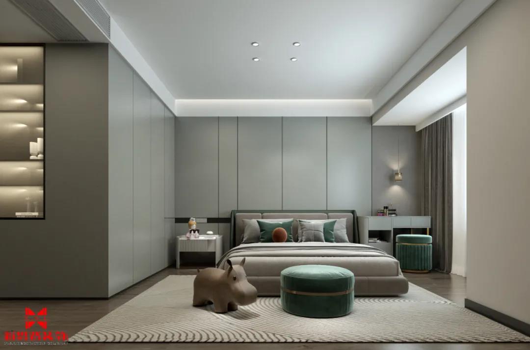 次臥沿用現(xiàn)代輕奢風(fēng)格的設(shè)計(jì)理念,主體采用線條、顏色的搭配來進(jìn)行裝飾,選擇柔和光源,打造出溫馨和寧靜的睡眠氛圍。