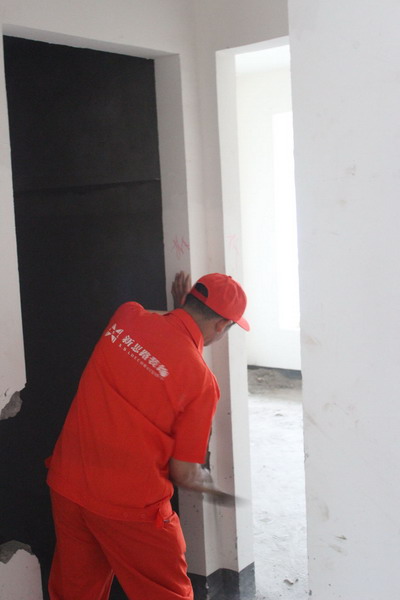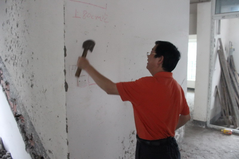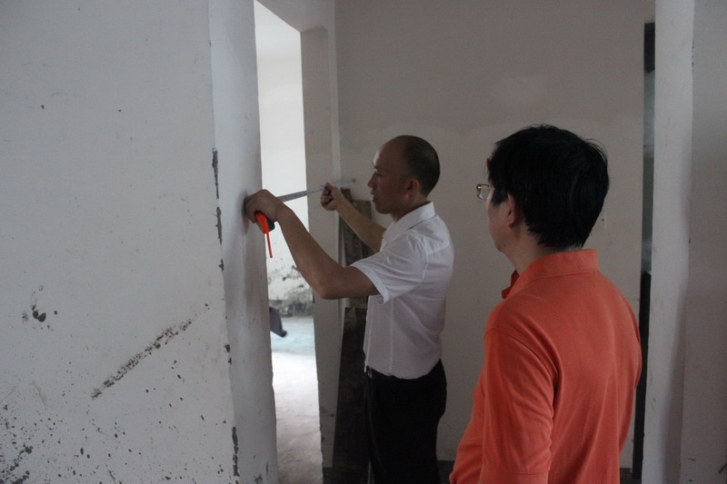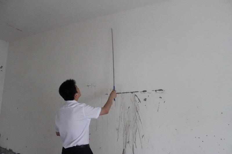 工程質(zhì)檢正在仔細檢查墻體有無空鼓情況。