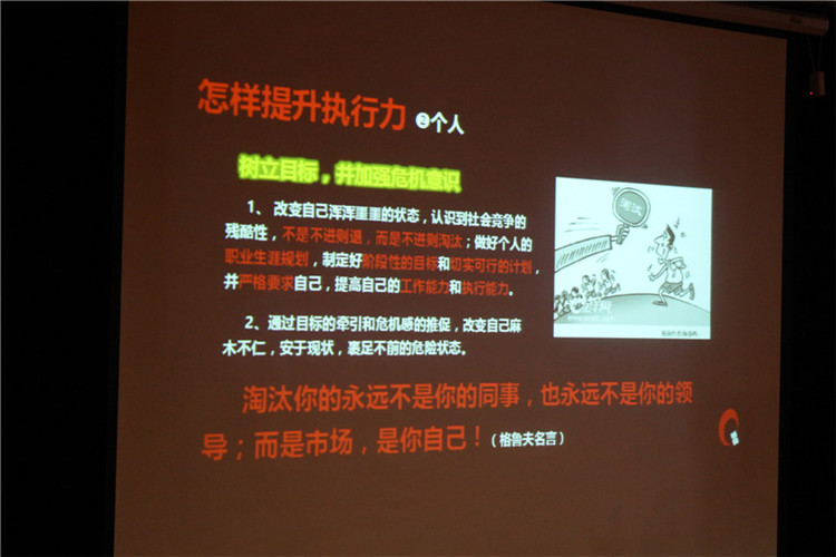 本次培訓(xùn)會以“贏在執(zhí)行”為主題,由張總親身授課。會上張總用視頻加案例的形式,詳盡地闡釋了“認(rèn)識執(zhí)行力”、“執(zhí)行力的重要性”、“提升執(zhí)行力的方法”、“執(zhí)行力的來源”、“執(zhí)行力對團隊的作用”及“執(zhí)行力對個人的影響”等重要內(nèi)容。為了提升會場氣氛,讓培訓(xùn)會變得妙趣橫生,培訓(xùn)會期間,張總與員工們別開生面的問詢,以及邀請部分員工們上臺分享心得,讓整個會場都沉浸在愉快歡悅的氣氛之中,員工們也更加認(rèn)真積極地聆聽著張總的知識。 在講到“為什么需要執(zhí)行力”時,張總以戰(zhàn)爭的殘酷性為主題,用八年抗戰(zhàn)中的南京大屠殺為例,講解了只有國家的強大,才能讓我們每個家庭的幸福,親人才不被欺凌,而這一切在國家、民族大義面前,舍小我而成大我的民族氣節(jié)及精神,值得我們敬仰;張總繼而轉(zhuǎn)向團隊發(fā)展:“只有強大的執(zhí)行力,才是實現(xiàn)團隊發(fā)展戰(zhàn)略的必要條件。堅守執(zhí)行,不斷努力,團隊好了,我們也就優(yōu)秀了,人生就豐富多彩。”會場的家人們響起雷鳴般的掌聲!