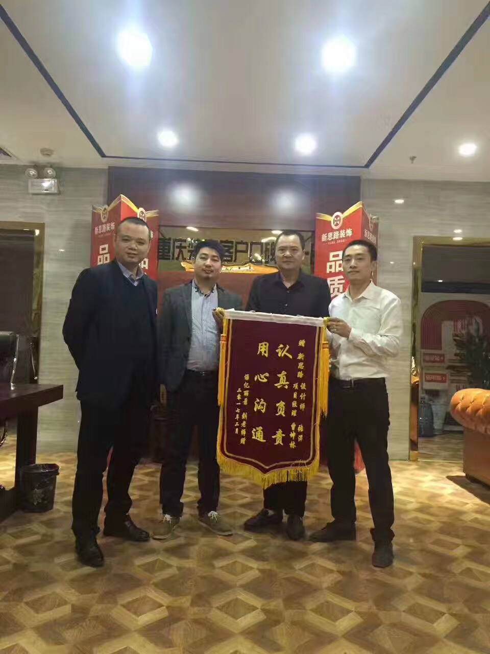 4月1日,來自保億麗景紫園的業(yè)主劉老師將一面印有“認(rèn)真負(fù)責(zé),用心溝通”的大紅錦旗交到渝北店雷店長手中,以感謝新思路裝飾高品質(zhì)的裝修質(zhì)量和服務(wù)水平。