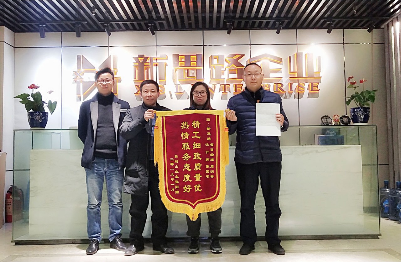 2019年1月23日下午,來(lái)自美利山業(yè)主張老師專程來(lái)到南坪總部,將一面印有“精工細(xì)致質(zhì)量?jī)?yōu),熱情服務(wù)態(tài)度好”的錦旗交給我們的設(shè)計(jì)師敖組長(zhǎng)和項(xiàng)目經(jīng)理周經(jīng)理手中,以感謝新思路裝飾高品質(zhì)工藝和優(yōu)質(zhì)貼心的家裝服務(wù)。