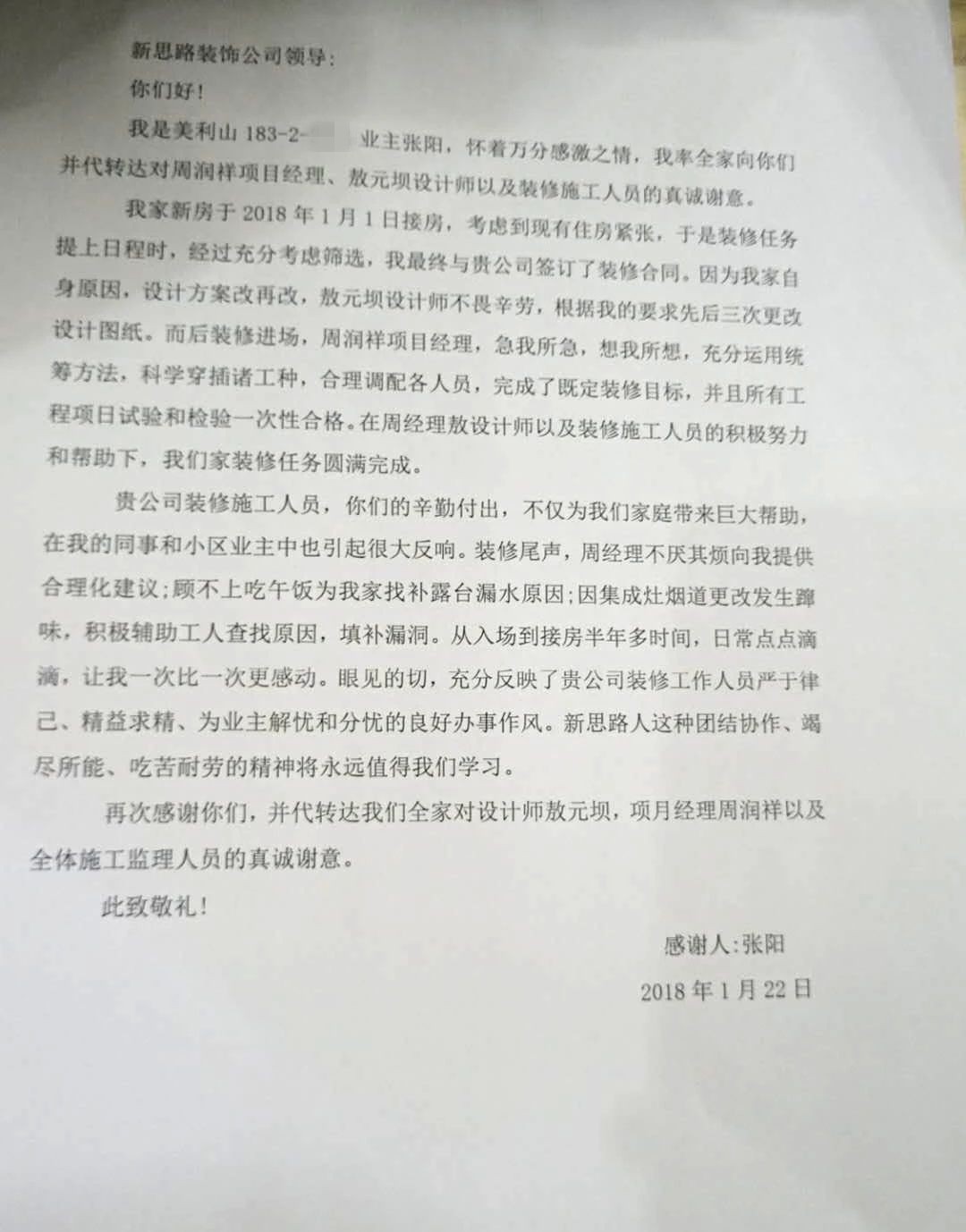 張老師說(shuō)到:“我家新房于2018年1月1日接房,考慮到現(xiàn)有住房緊張,于是裝修任務(wù)提上日程時(shí),經(jīng)過(guò)充分考慮篩選,我最終與貴公司簽訂了裝修合同。因?yàn)槲壹易陨碓颍O(shè)計(jì)方案改再改,敖設(shè)計(jì)師不畏辛勞,根據(jù)我的要求先后三次更改設(shè)計(jì)圖紙。而后裝修進(jìn)場(chǎng),項(xiàng)目經(jīng)理周經(jīng)理,急我所急,想我所想,充分運(yùn)用統(tǒng)籌方法,科學(xué)穿插諸工種,合理調(diào)配各人員,完成了既定裝修目標(biāo),并且所有工程項(xiàng)目試驗(yàn)和檢驗(yàn)一次性合格。在周經(jīng)理敖設(shè)計(jì)師以及裝修施工人員的積極努力和幫助下,我們家裝修任務(wù)圓滿完成。貴公司裝修人員,你們的辛勤付出,不僅為我們家庭帶來(lái)巨大幫助,在我的同事和小區(qū)業(yè)主中也引起很大反應(yīng)。從入場(chǎng)到接房半年多時(shí)間,日常的點(diǎn)點(diǎn)滴滴,讓我一次比一次更感動(dòng)。眼見(jiàn)的一切,充分反映了貴公司裝修工作人員嚴(yán)于律己、精益求精、為業(yè)主解憂和分憂的良好辦事作風(fēng)。真的,再次感謝你們,并代轉(zhuǎn)達(dá)我們?nèi)覍?duì)敖設(shè)計(jì)師和項(xiàng)目經(jīng)理周經(jīng)理以及全體施工監(jiān)理人員的真誠(chéng)謝意!“