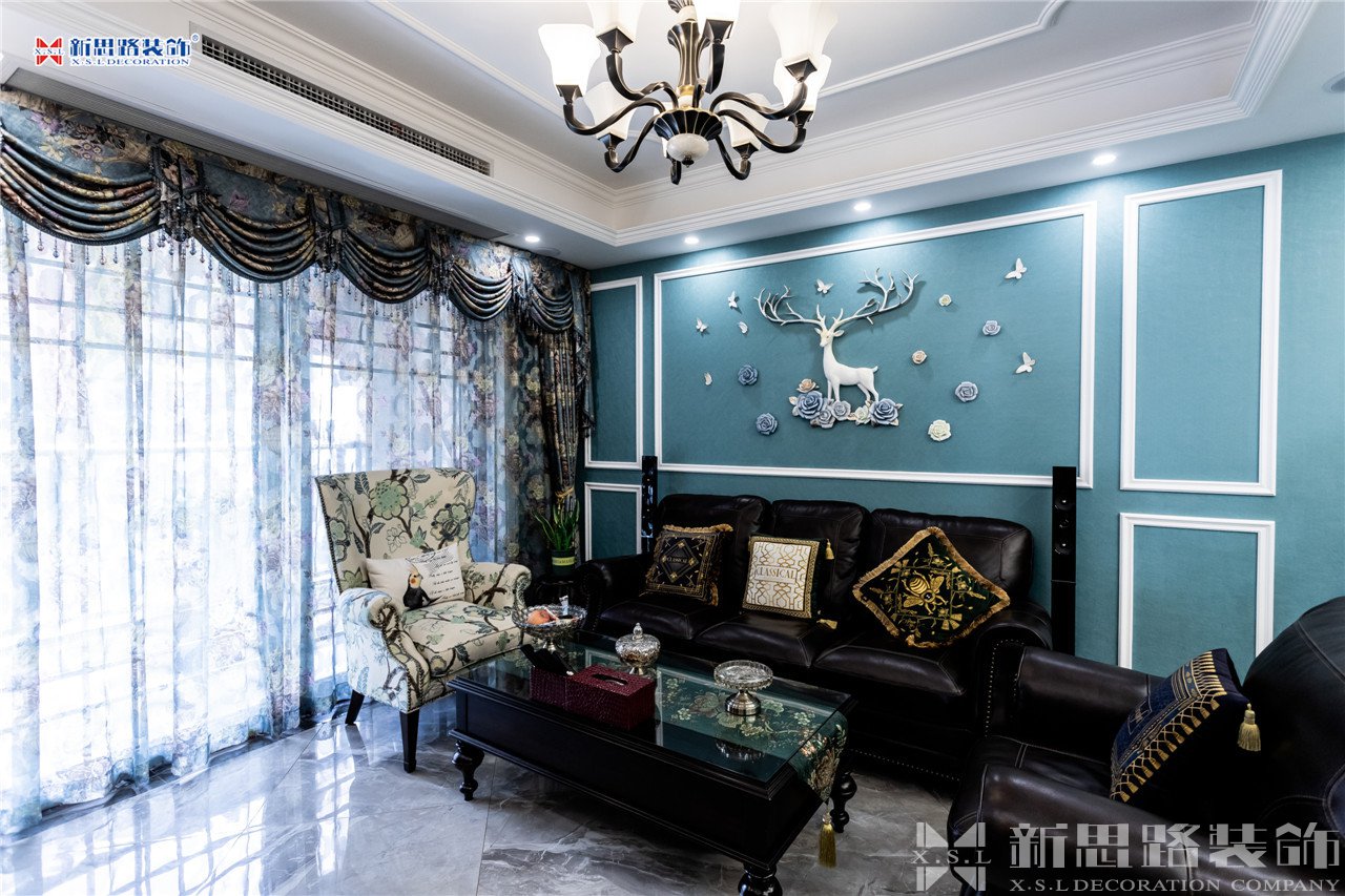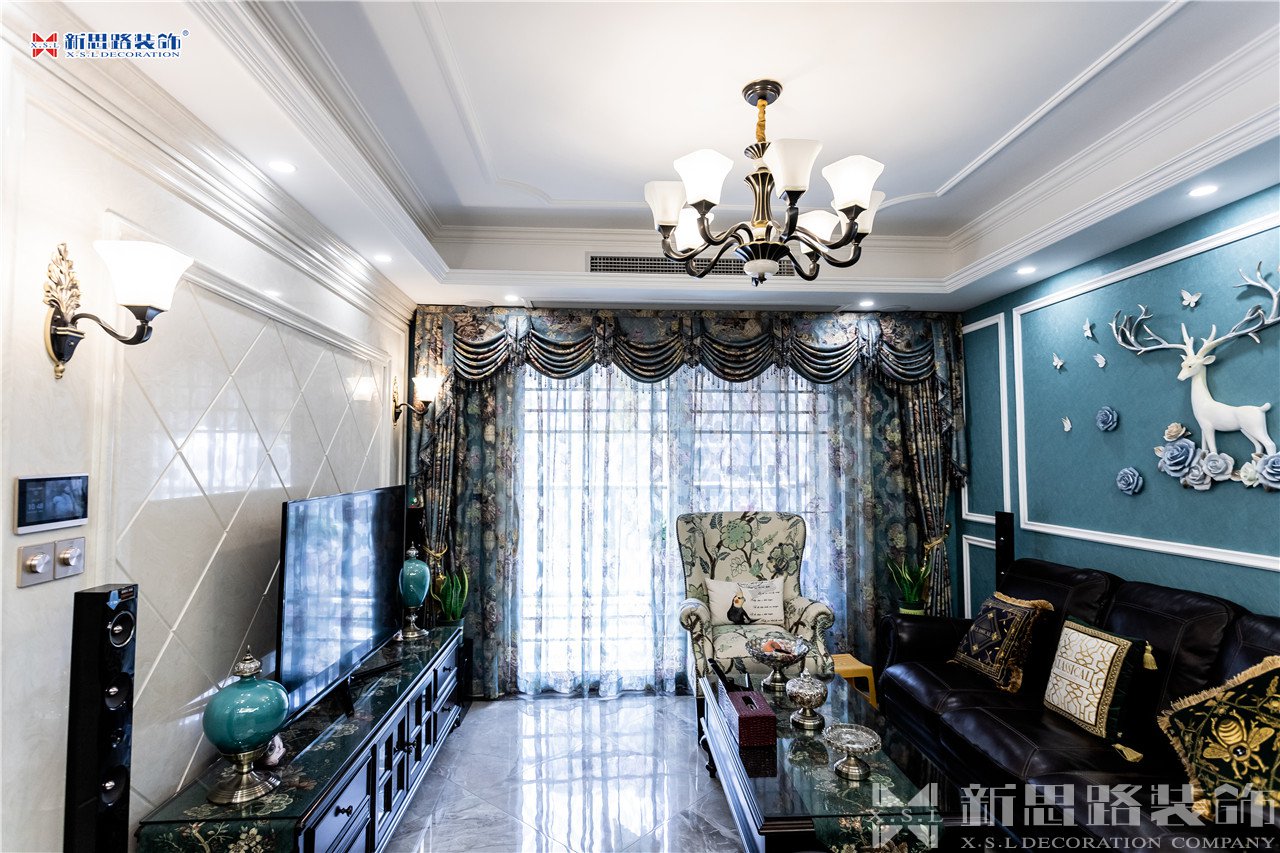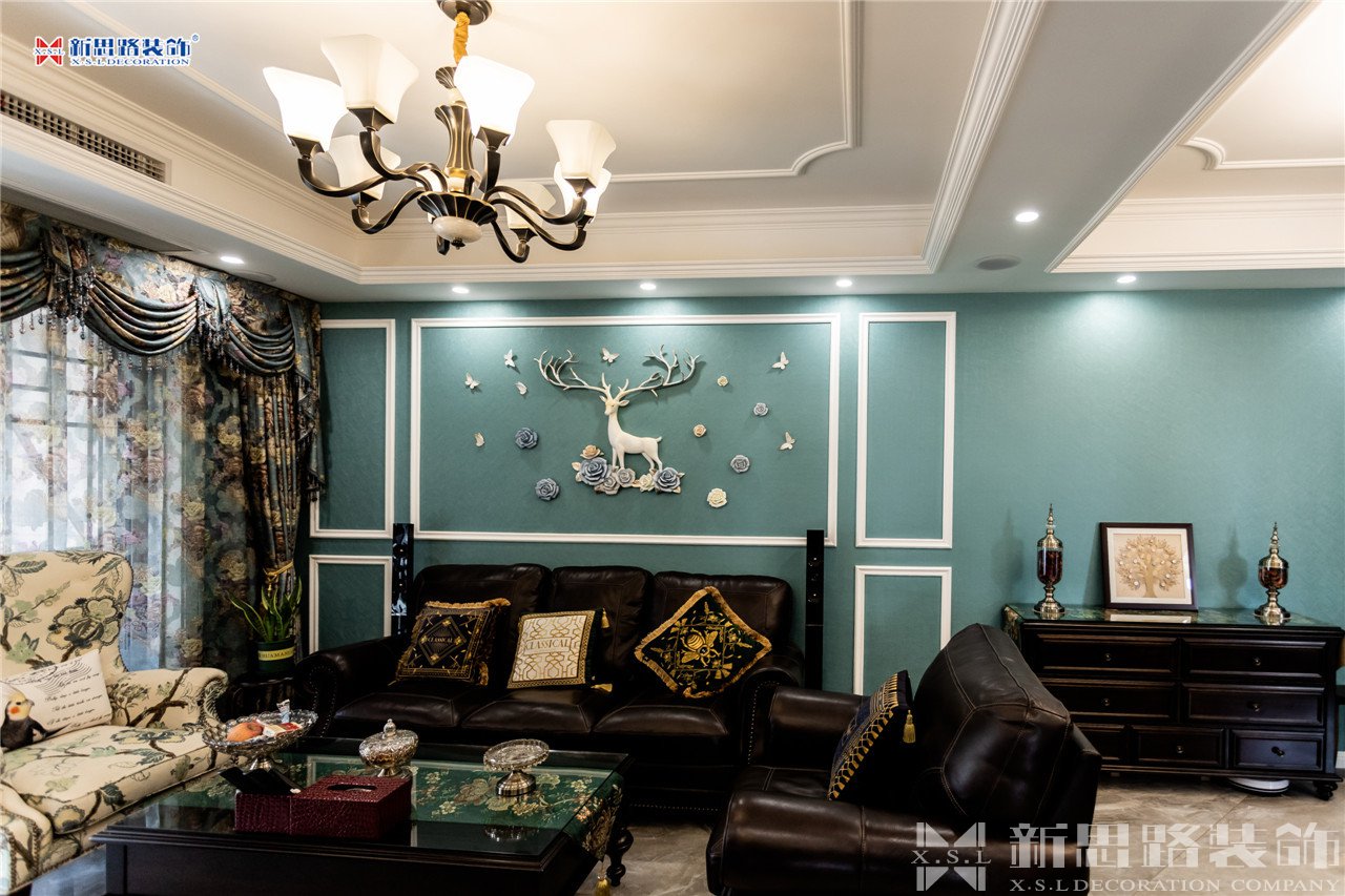 沙發(fā)背景墻使用石膏線材勾畫幾何圖形,古典優(yōu)雅;陶瓷的小鹿漫步花間,野趣橫生。復(fù)古花色的窗簾與真皮質(zhì)地的沙發(fā)以及實(shí)木電視柜搭配起來正合適,線條分割成菱形網(wǎng)格狀的乳白色電視背景墻大方低調(diào),黃銅色美式吊燈干凈明亮。深墨綠色的織錦桌旗無形中又添了點(diǎn)奢華意味,油青色的仿古裝飾擺件也是非常經(jīng)典的美式元素體現(xiàn)。