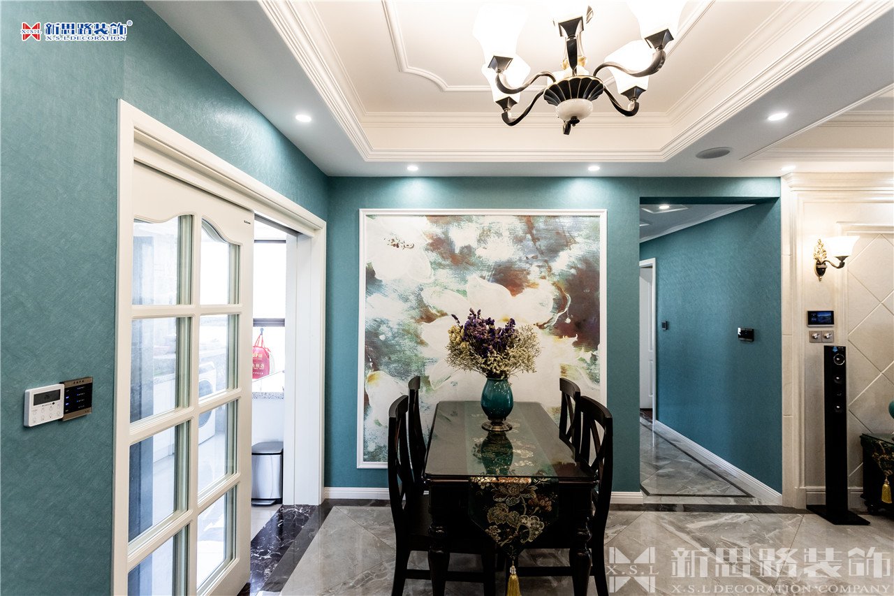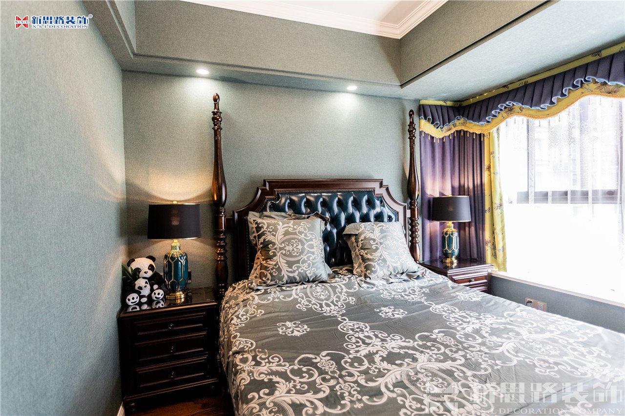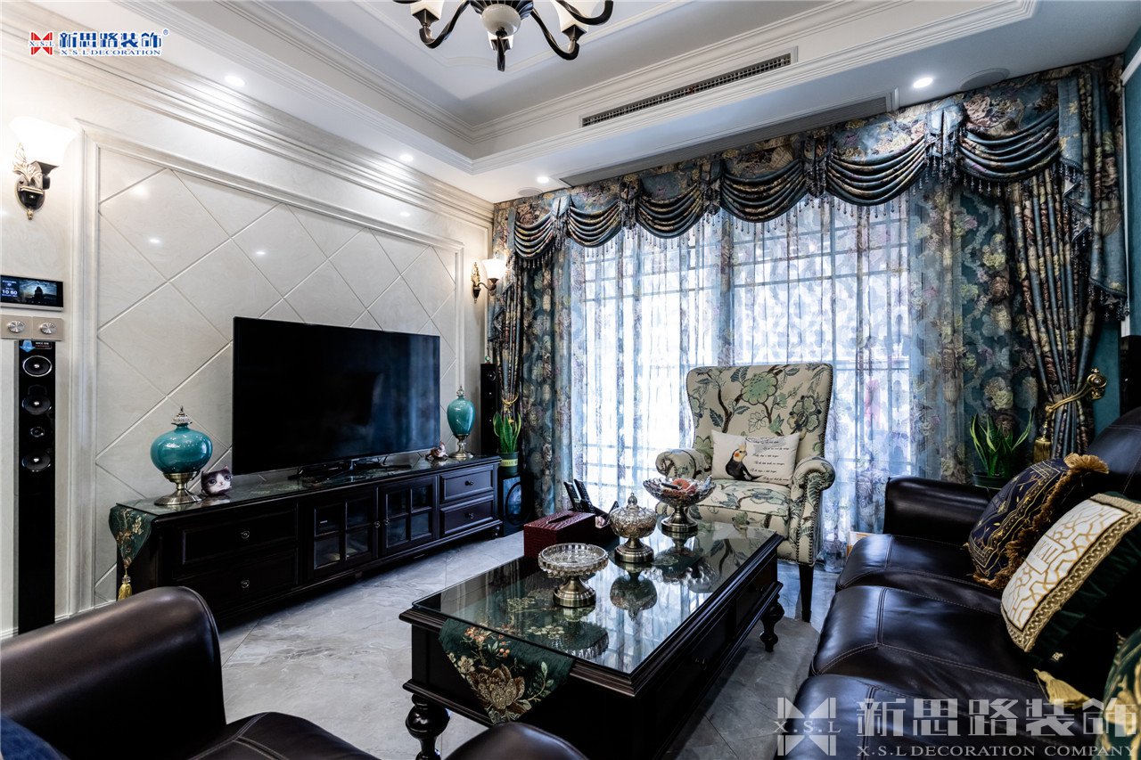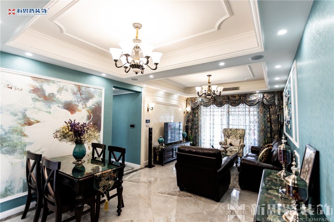 沙發(fā)背景墻使用石膏線材勾畫幾何圖形,古典優(yōu)雅;陶瓷的小鹿漫步花間,野趣橫生。復(fù)古花色的窗簾與真皮質(zhì)地的沙發(fā)以及實(shí)木電視柜搭配起來正合適,線條分割成菱形網(wǎng)格狀的乳白色電視背景墻大方低調(diào),黃銅色美式吊燈干凈明亮。深墨綠色的織錦桌旗無形中又添了點(diǎn)奢華意味,油青色的仿古裝飾擺件也是非常經(jīng)典的美式元素體現(xiàn)。