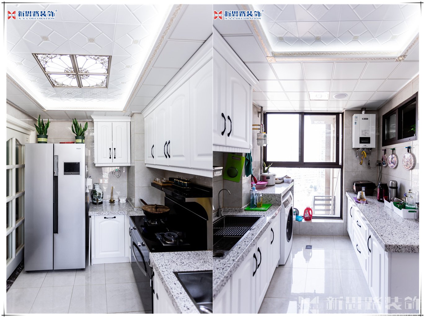 廚房灶臺(tái)使用白色大理石材質(zhì)打造,料理臺(tái)的設(shè)計(jì)更方便食物的制作。櫥柜顏色也選取了同色系的白色,清新干凈,讓本是油煙滿滿的廚房視覺上看起來明亮整潔。