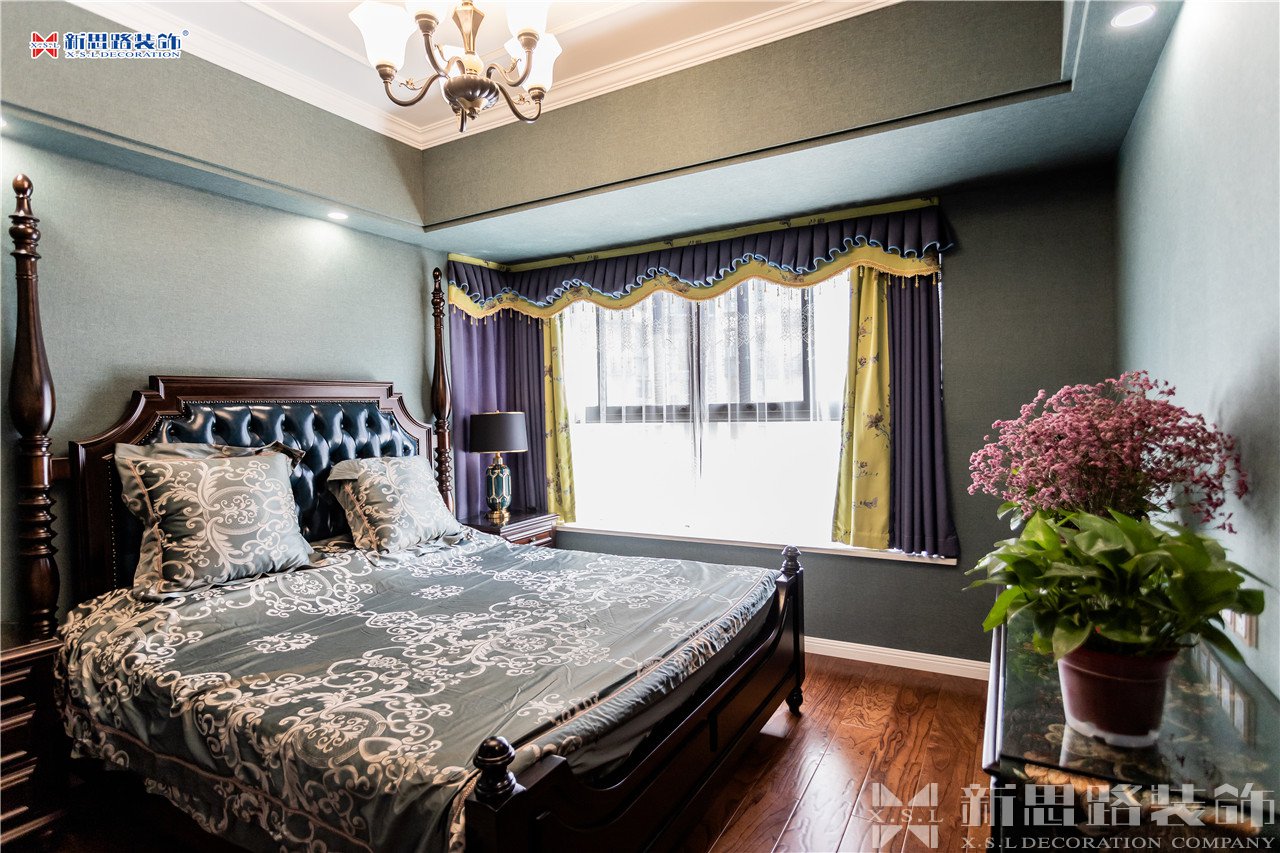 深色木質(zhì)家具與復(fù)古風(fēng)的裝飾正是美式裝修風(fēng)格的亮點(diǎn)之一,深青色的皮質(zhì)床頭與墻面色系相統(tǒng)一。衛(wèi)生間的浴缸設(shè)計(jì)非常適合休息之時(shí)放松泡澡,桌子上的上永生花與盆栽點(diǎn)綴房間,生機(jī)勃勃。