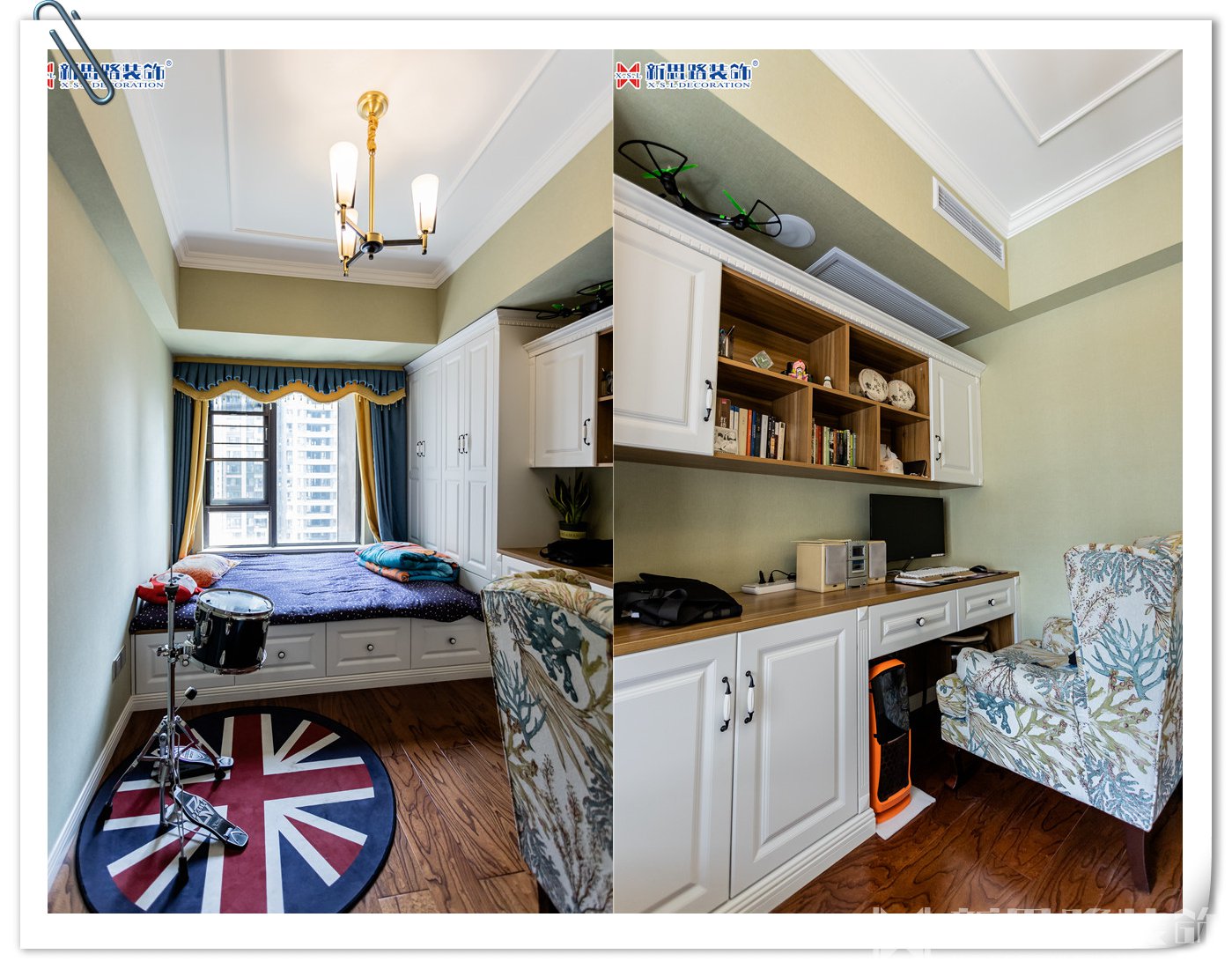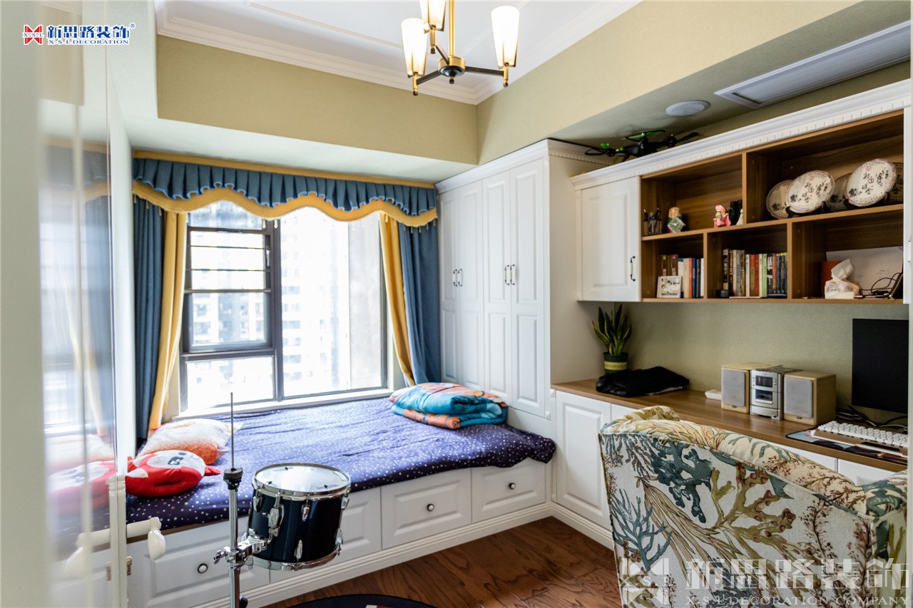次臥是帥氣兒子的房間。學(xué)生難免書籍和雜物較多,床鋪采用榻榻米的設(shè)計(jì)更便于物品收納,長(zhǎng)條形的書桌在擺放電腦后仍留有許多空間。書架近在咫尺,手邊是舊式磁帶播放器,心愛的架子鼓就在身后,音樂夢(mèng)想和學(xué)習(xí)并不沖突,小小的空間滿載的是青春的律動(dòng)。
