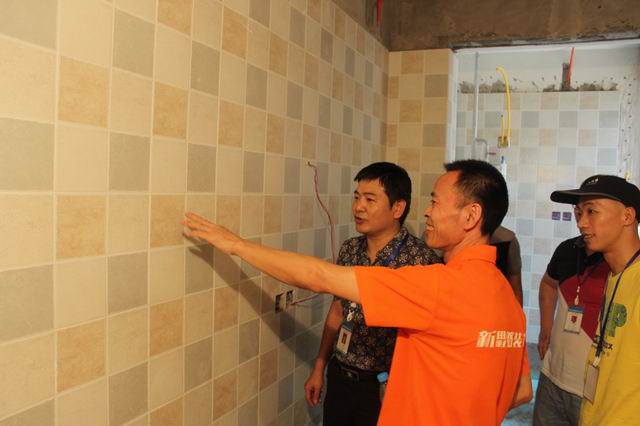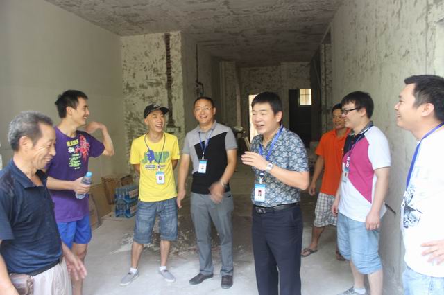 工人師傅在向張總及慰問小組一行匯報自己貼磚工藝及工作情況