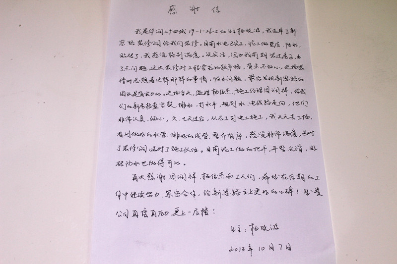 堅持客戶口碑第一:業(yè)主喜送感謝信