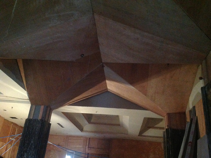 譚經(jīng)理在向設(shè)計師介紹木工吊頂工藝細節(jié)