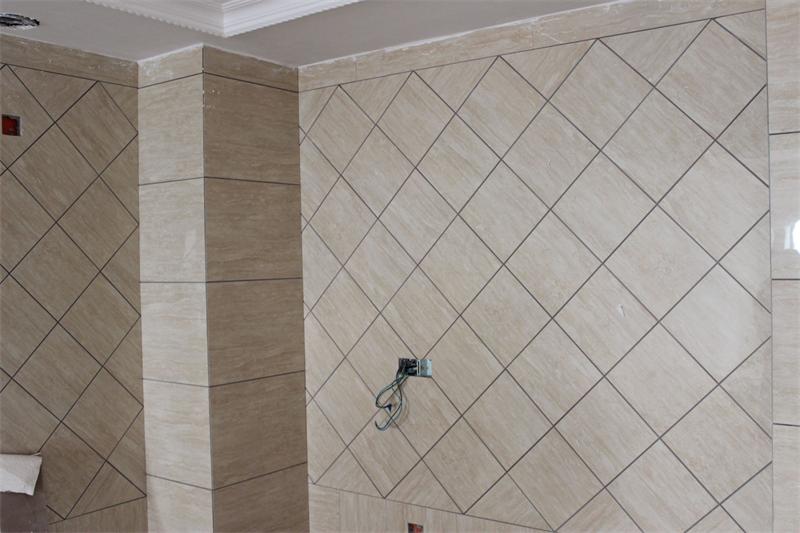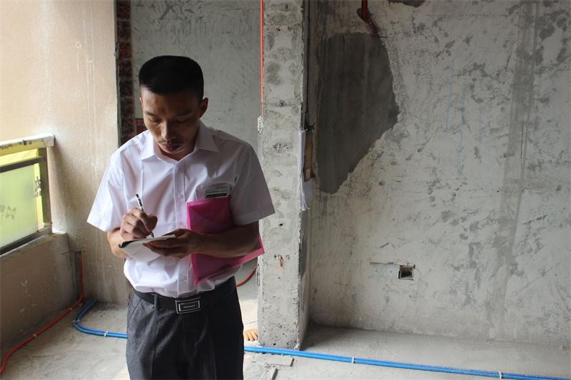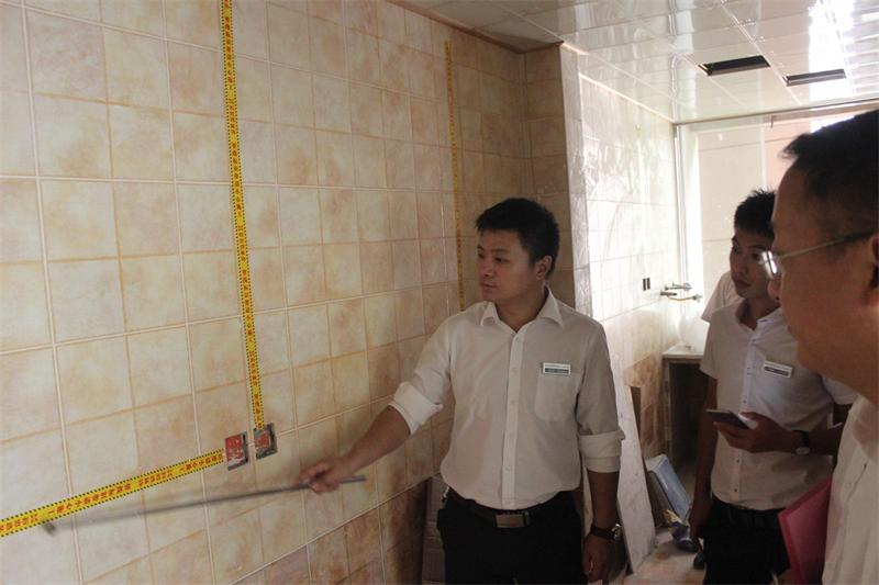 片區(qū)張經(jīng)理正在認真檢查墻面貼磚情況