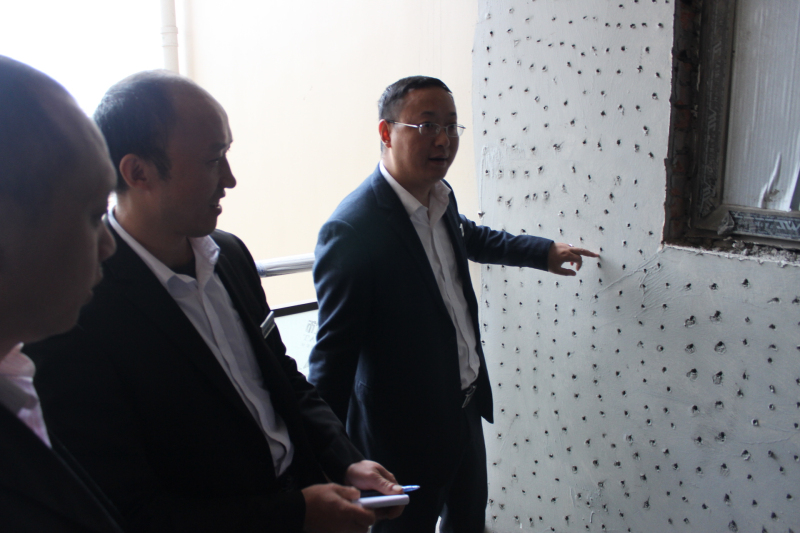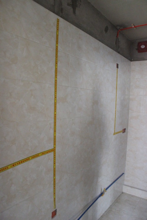 文經(jīng)理正在認(rèn)真檢查墻面貼磚情況