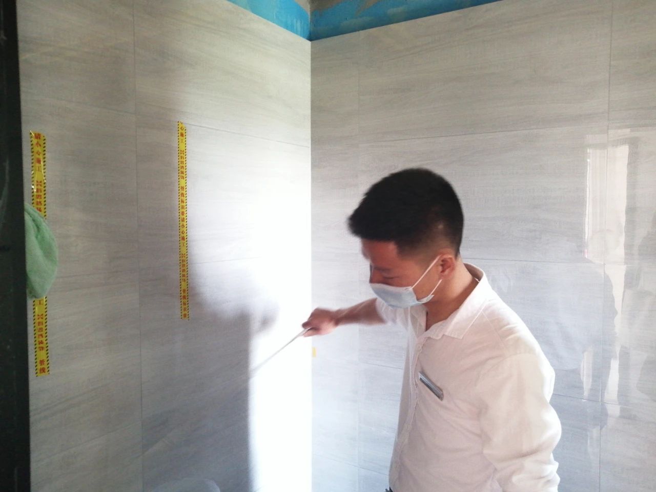 ▲工程質(zhì)檢談代超在檢查墻磚是否有空鼓