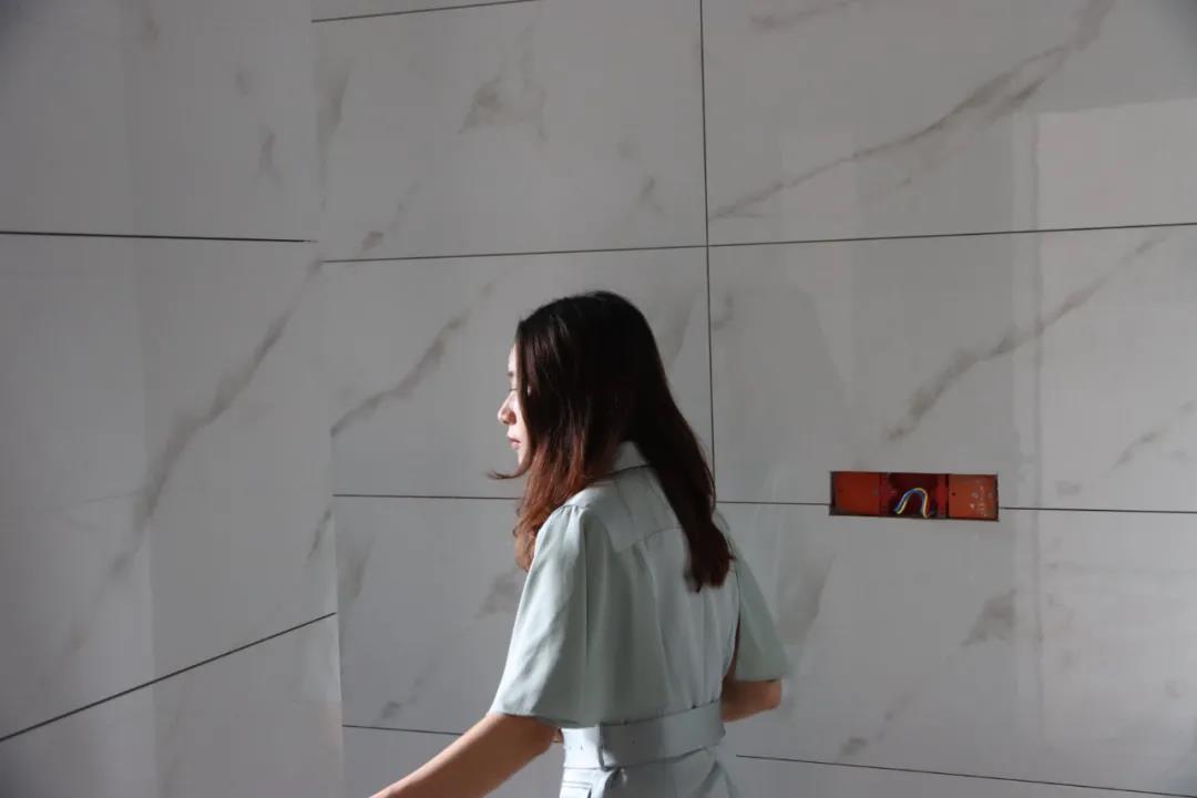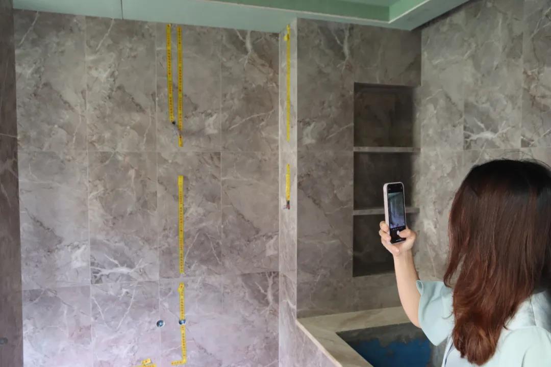 這處工地正在進行硬裝階段,我們的工人師傅正在工地上進行貼磚的工作。設(shè)計師陳薇仔細檢查墻面的瓷磚接縫是否符合我們的工程要求,再與工人師傅一起交流了一些工地上的問題,了解到目前的工程進度。