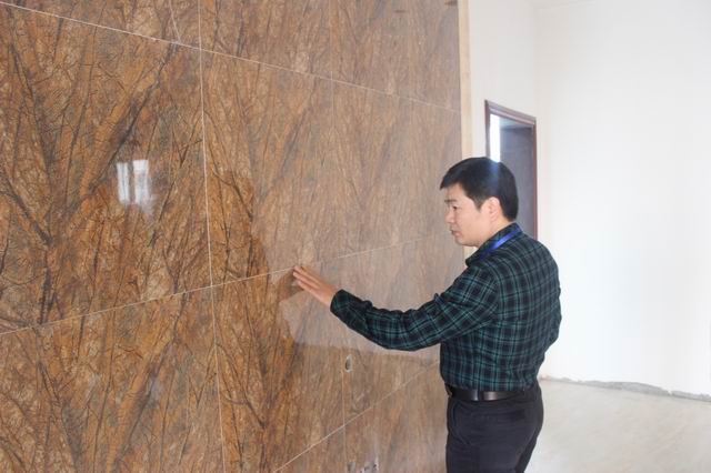張總在仔細(xì)檢查墻面貼磚工藝細(xì)節(jié)