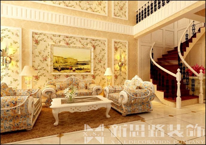 二、“回歸自然”, 田園美式軟裝風格室內(nèi)定要有花草來增添生機與活力。復古的墻門造型,有鄉(xiāng)村自然般的特色。碎花壁紙與碎花沙發(fā)相統(tǒng)一。中間的灰色沙發(fā)過渡,防止審美疲勞。臥室的設計中大量使用碎花布藝,家具則宜簡單化。