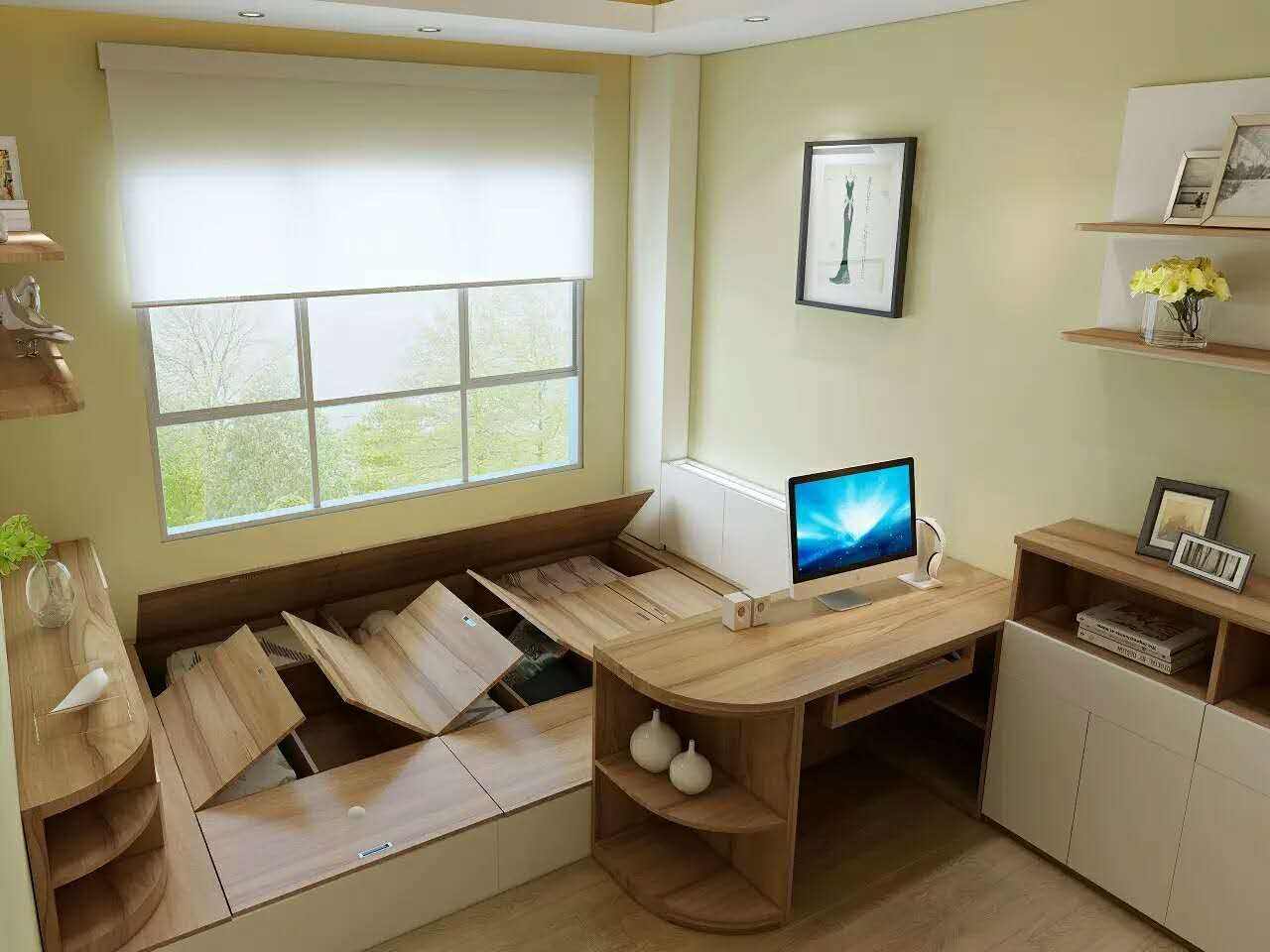這個(gè)空間設(shè)計(jì)主要是借鑒了日式榻榻米的風(fēng)格,地臺(tái)高度為45cm,因?yàn)榭紤]到要住人,不能離地面比較高。一般做睡床的地臺(tái)高度為45—50cm比較好。而且這個(gè)高度,地臺(tái)下也可以做儲(chǔ)物空間,把床上用品放在地臺(tái)下的柜子里,節(jié)約空間。